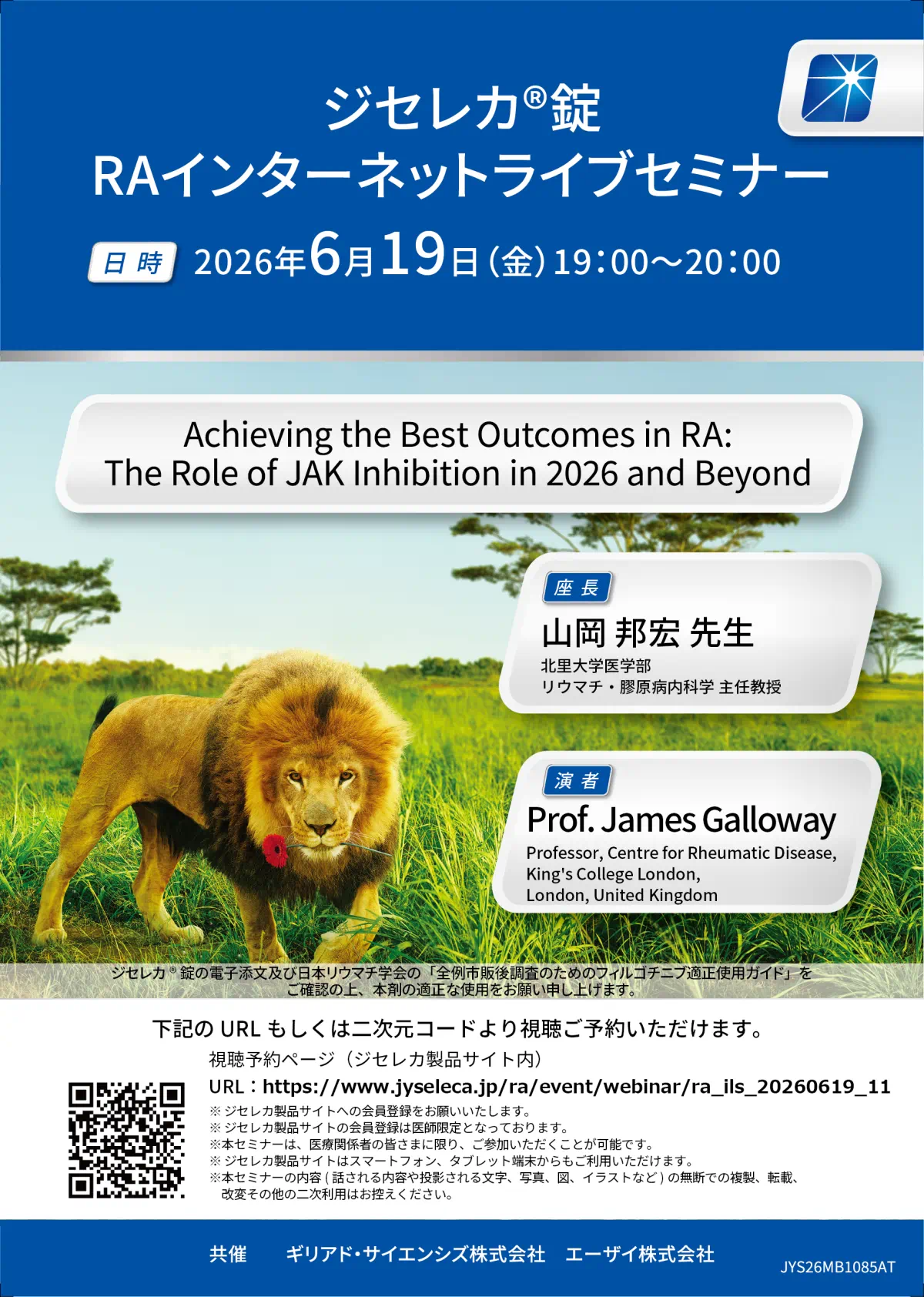 また、JAK阻害薬ジセレカ錠に関する臨床試験結果に加え、欧州のリアルワールドデータ(FILOSOPHY、PARROTFISH)を基に、有効性と安全性について包括的にご紹介いただきます。