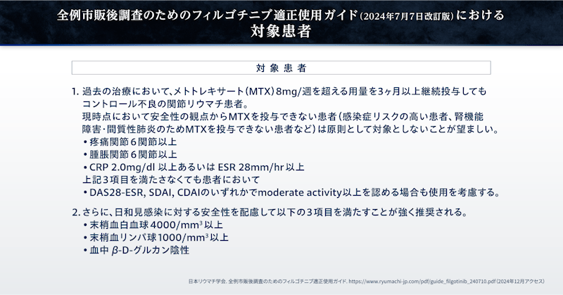 - 全例市販後調査のためのフィルゴチニブ適正使用ガイド(2024年7月7日改訂版)における対象患者【03:23】